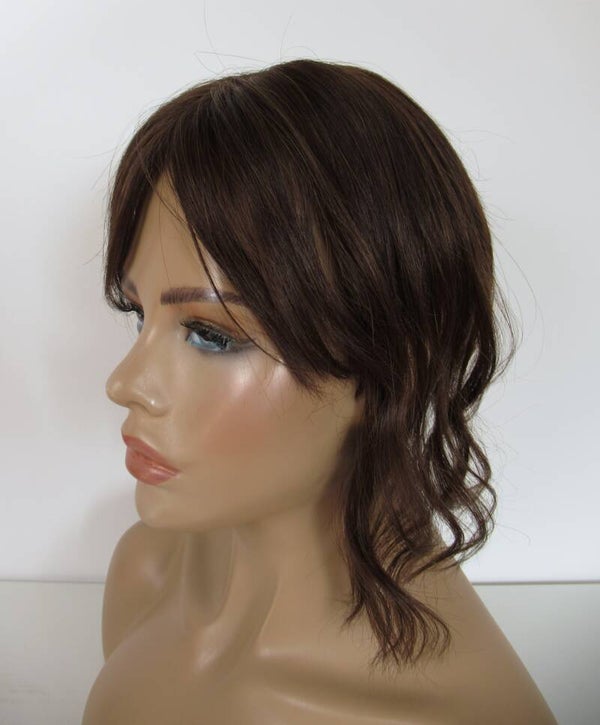 De hairpiece is voorzien van een subtiele curtain bangs / zijpony die ook helpt een terugwijkende haarlijn te bedekken.